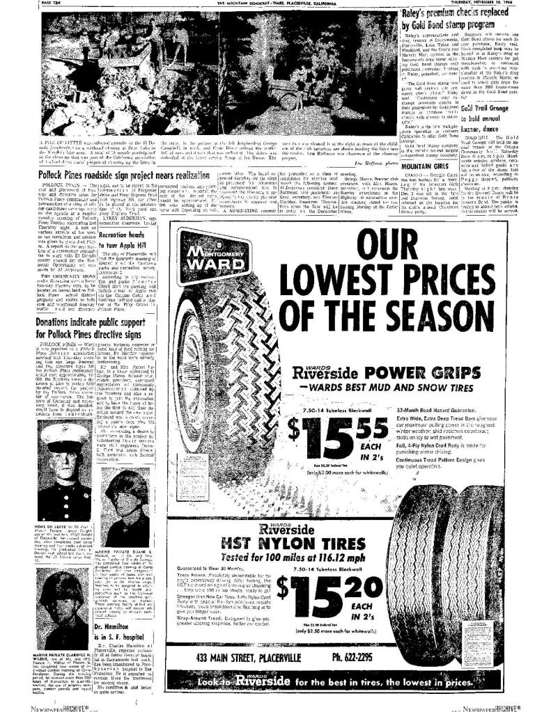 10 Nov 1966, page 10: Donations indicate public support for Pollock Pines directive signs – Duane B. Ford, civil engineer, Bechtel corporation