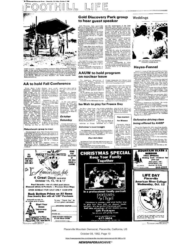 8 Oct 1982: Gold Discovery Park group to hear guest speaker – author of “Mormons and the Discovery of Gold“