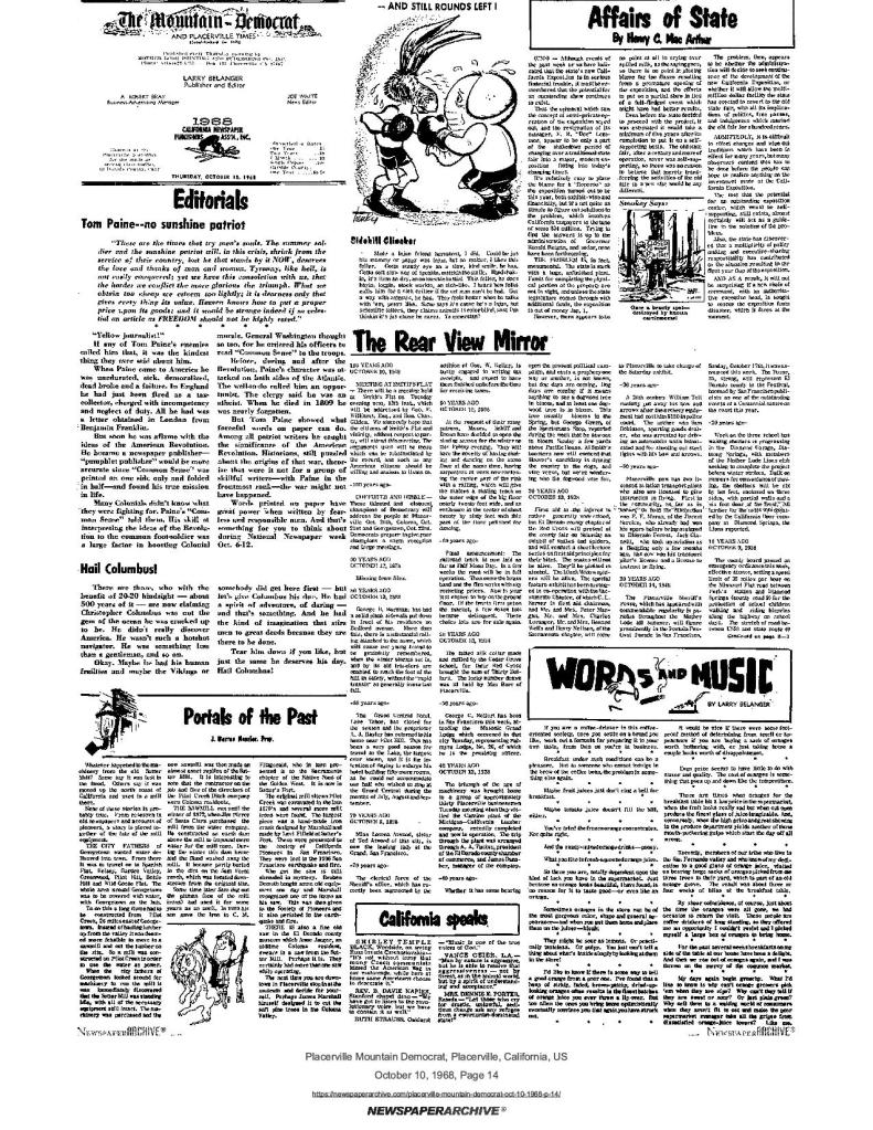 10 Oct 1968, page 14: Portals of the past, part 3 – history of Mormon Battalion and gold discovery by Marshall at Sutter’s Mill in Coloma