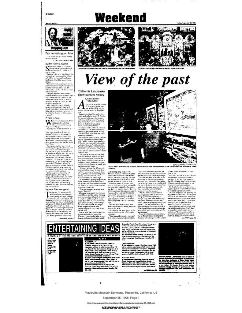 25 Sep 1998, page B-1: View of the past: ‘California Landmarks’ show portrays history – includes role of Mormon Battalion in gold discovery history, features detailed works of watercolorist Nancy Pratt
