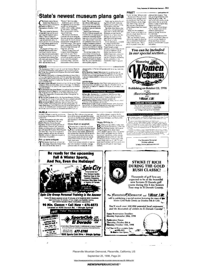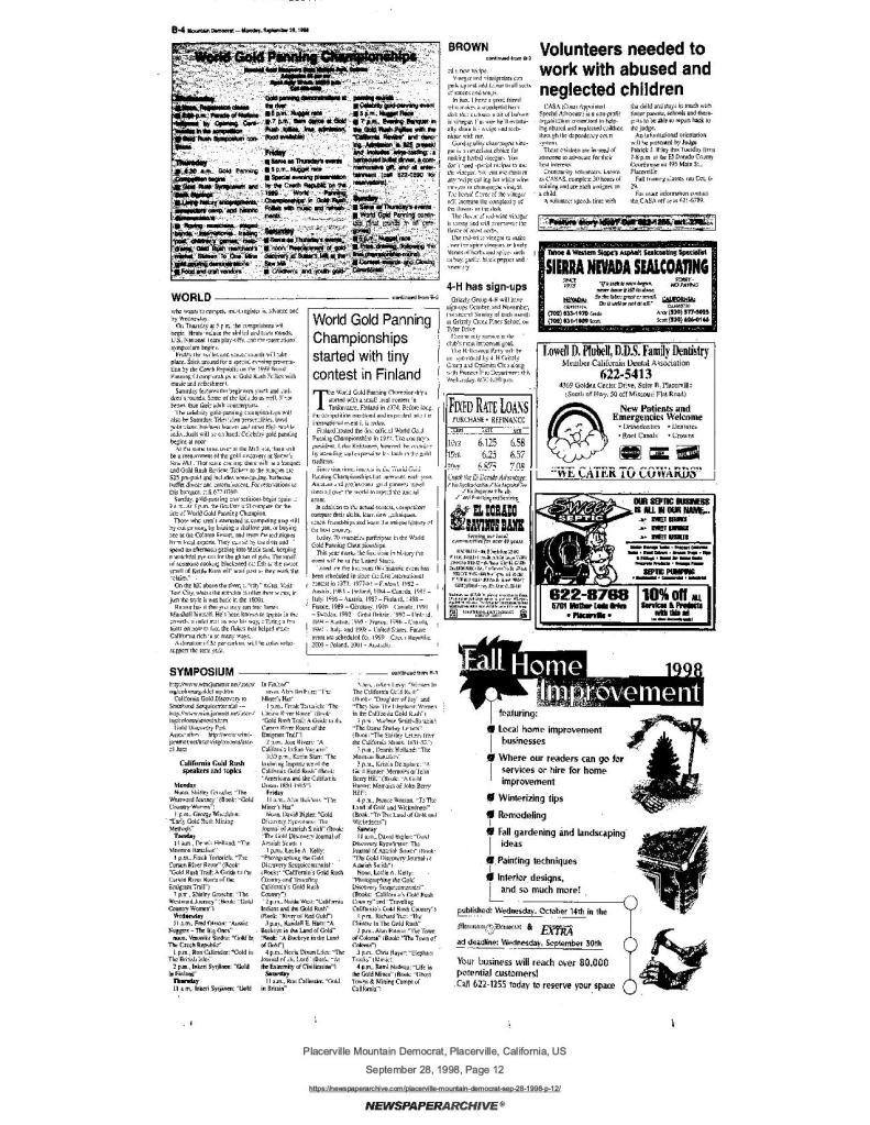 28 Sep 1998, page B-4: Welcome to Gold Country – World Gold Panning Championships are here, it will be bigger than the January Sesquicentennial, and Educational symposium featuring more speakers and authors ever
