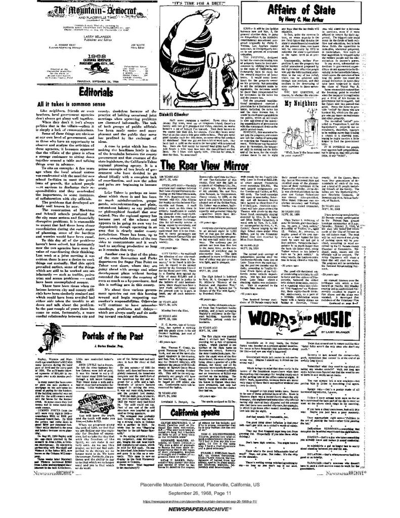 26 Sep 1968, page 11: Portals of the past, part 2 – history of Mormon Battalion and gold discovery by Marshall at Sutter’s Mill in Coloma