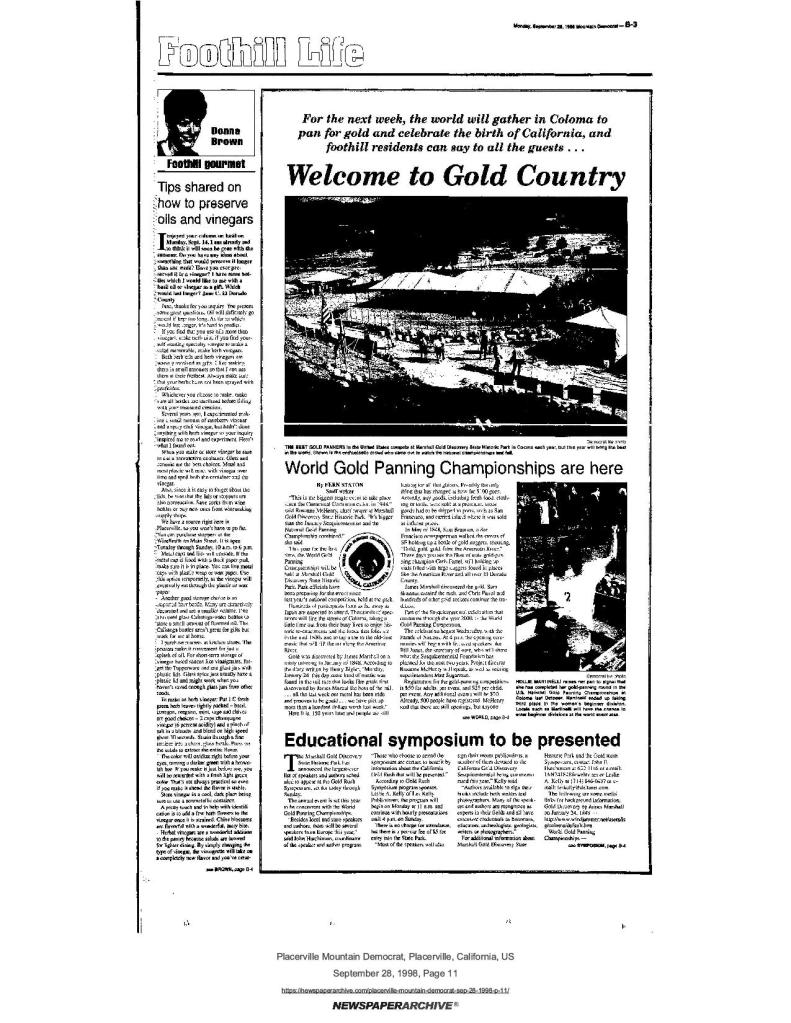 28 Sep 1998, page B-3: Welcome to Gold Country – World Gold Panning Championships are here, it will be bigger than the January Sesquicentennial, and Educational symposium featuring more speakers and authors ever